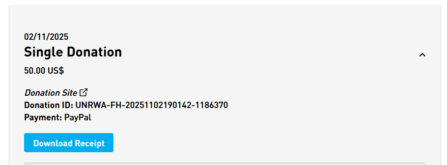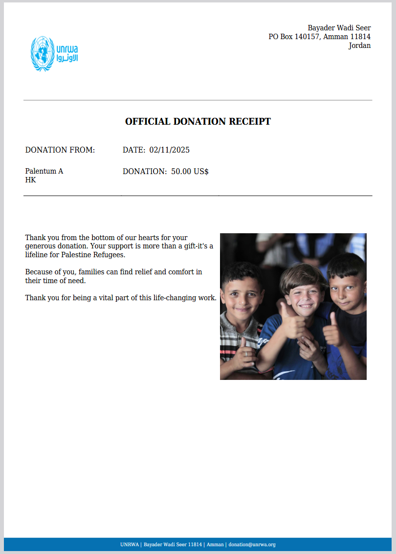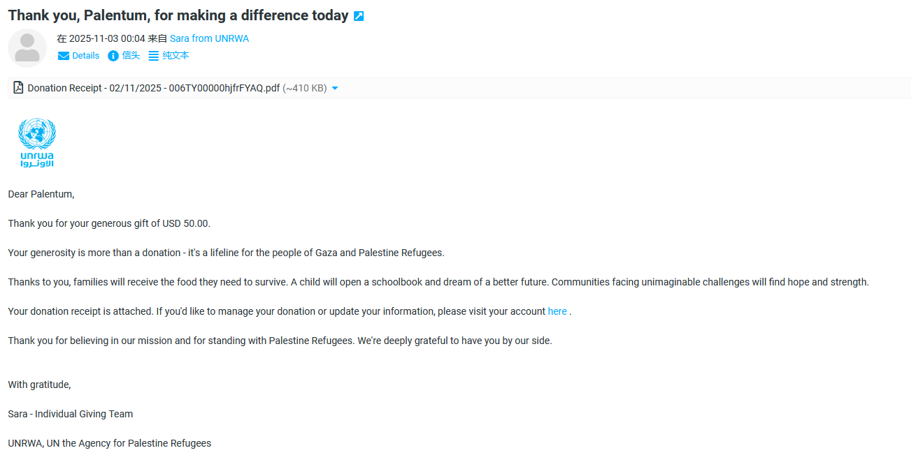 2025年10月没有超额捐赠,本人个人捐赠50USD,已捐赠至联合国近东巴勒斯坦难民救济和工程处
